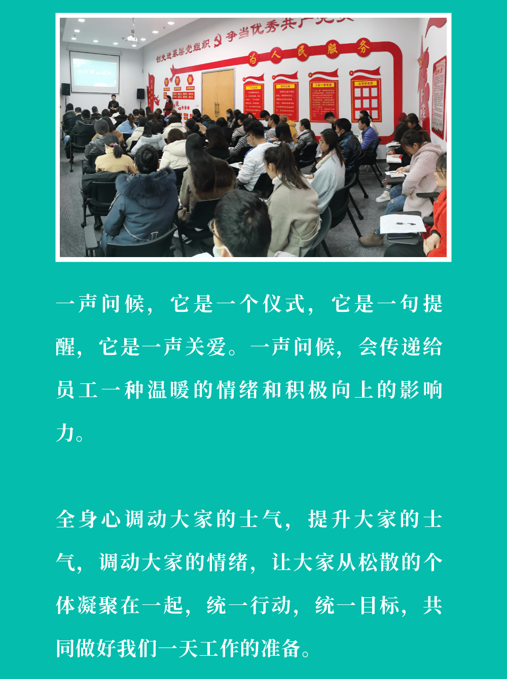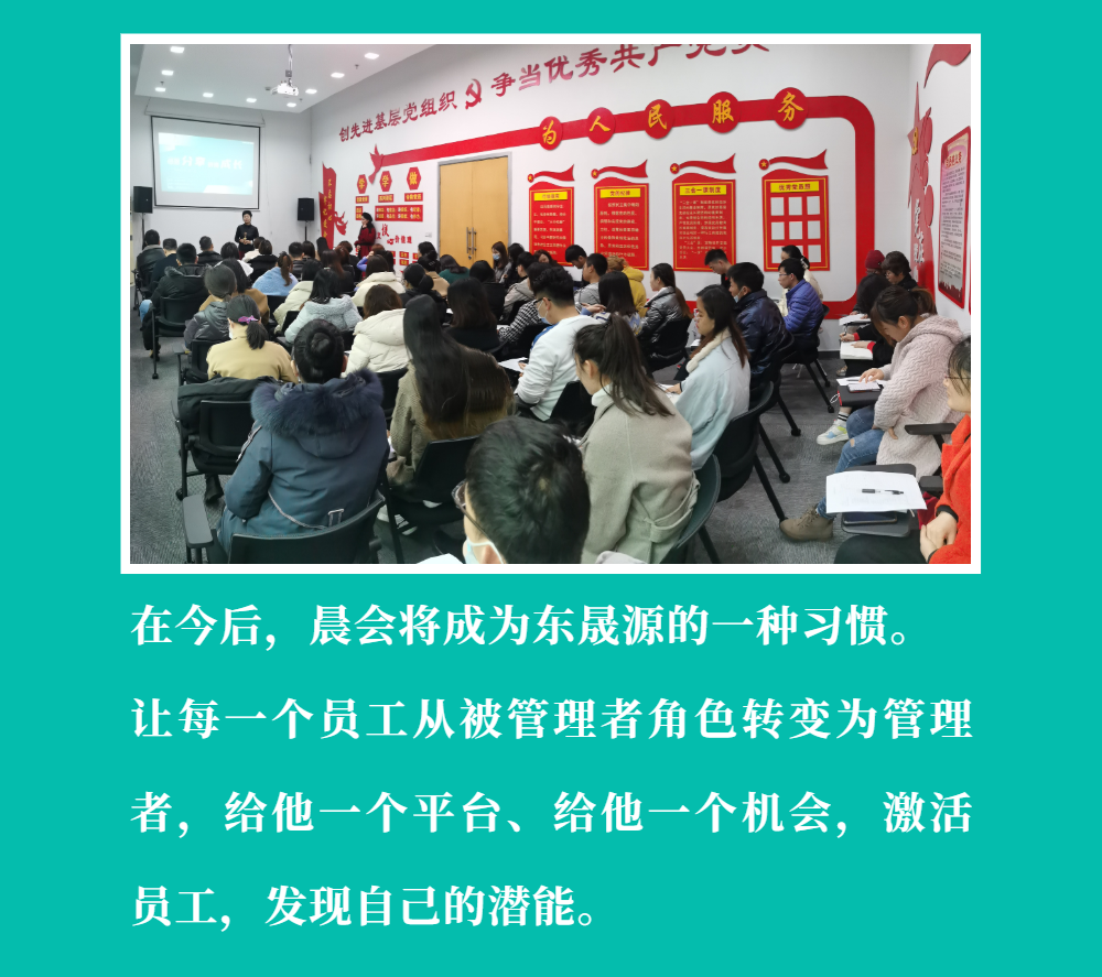 东晟源晨会正式启动,让每一个员工从被管理者角色转变为管理者,给他一个平台、给他一个机会,激活员工,发现自己的潜能。
