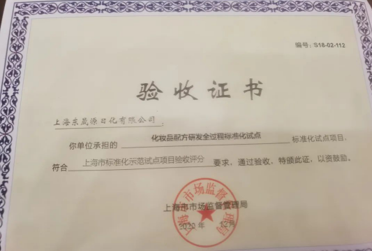 2020年12月29日,上海东晟源日化有限公司受上海市市场监督管理局标准创新发展处的委托,松江区市场监督管理局组织专家在我司召开《上海市高新技术产业标准化试点项目》考核验收会。上海东晟源“化妆品配方研发全过程标准化”试点项目高分通过验收并于2021年7月19日举行授牌仪式。